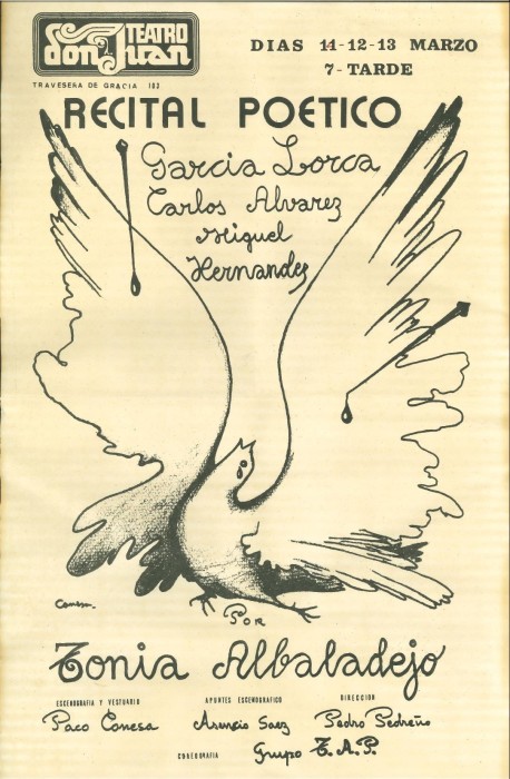Poster/portrait of poet Carlos Álvarez, acknowledgment in credits, and invitation to the premiere