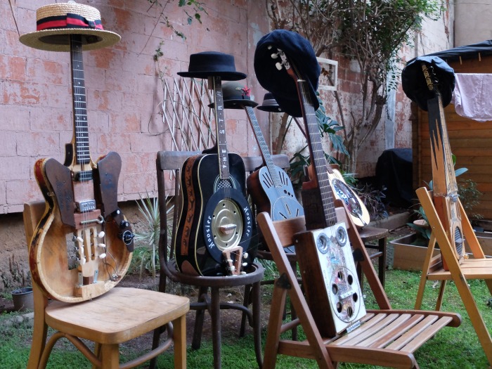 Pieza única sin uso hecha a mano siguiendo la tradición de los primeros bluesman en Norte América que construían instrumentos con material de reciclaje como cajas de puros, latas, maderas antiguas, alambre, llaves, clavos, etc. Se trata de una guitarra de cuatro cuerdas con electrónica de calidad, esto permite conectarla a un amplificador de guitarra y disfrutar de un sonido potente y primitivo que nos lleva al sur, al Mississippi, a los antiguos garitos conocidos como "barrel house" donde las gentes negras se reunían a interpretar el blues más crudo y energético. Envíos solo territorio nacional.